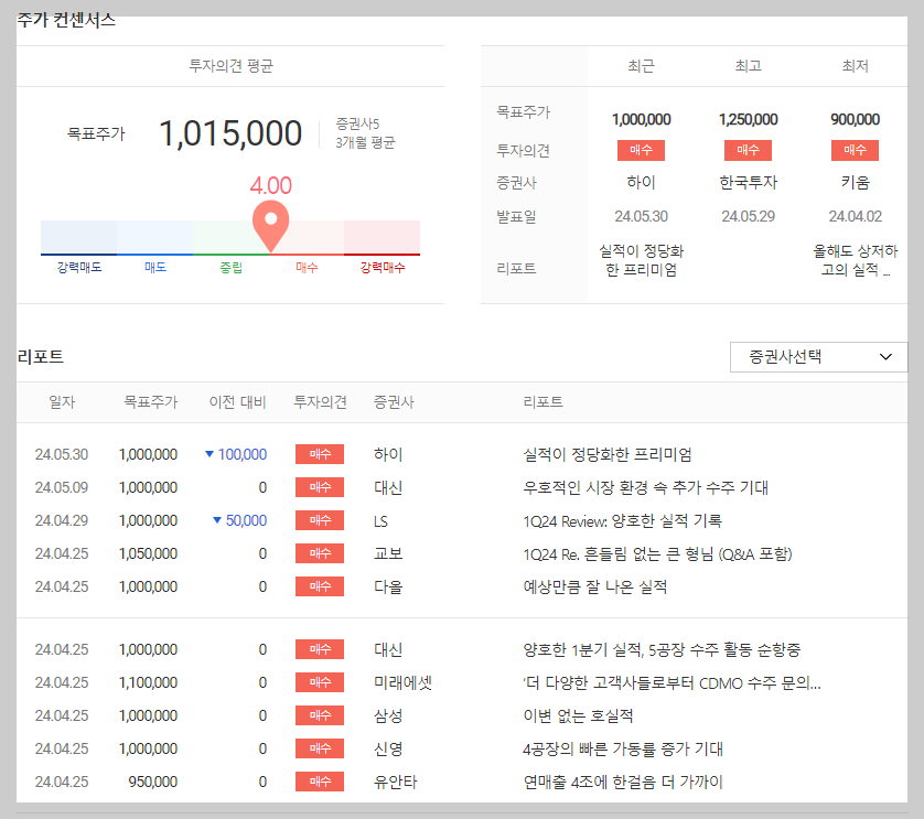 삼성바이오로직스 목표 주가 투자 의견