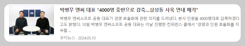 -2023년 12월 전년동기 대비 연결기준 매출액은 30.8% 감소, 영업이익은 75.4% 감소, 당기순이익은 51.3% 감소. 2023년 12월 출시된 온라인 MMO RPG '쓰론 앤 리버티'는 적극적인 소통을 통해 유저 피드백을 반영하고 게임 플레이 경험을 지속 제고하고 있음. 2024년 동사는 다양한 플랫폼, 장르를 아우르는 신작들을 순차적으로 시장에 선보일 계획임.