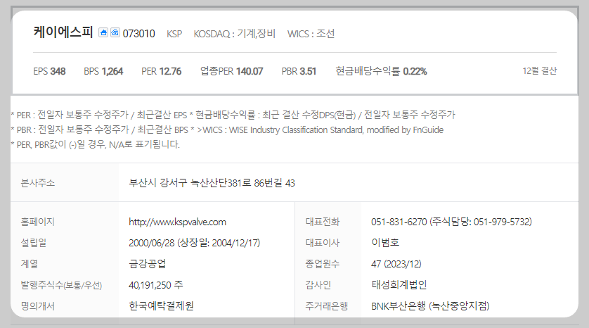 케이에스피는 조선 기업입니다. 대표자는 이범호이며 설립일은 2000/06/28, 주식 상장일은 2004/12/17입니다. 전체 종업원 수는 47명이고 본사 주소는 부산시 강서구 녹산산단 381로 86번 길 43입니다.