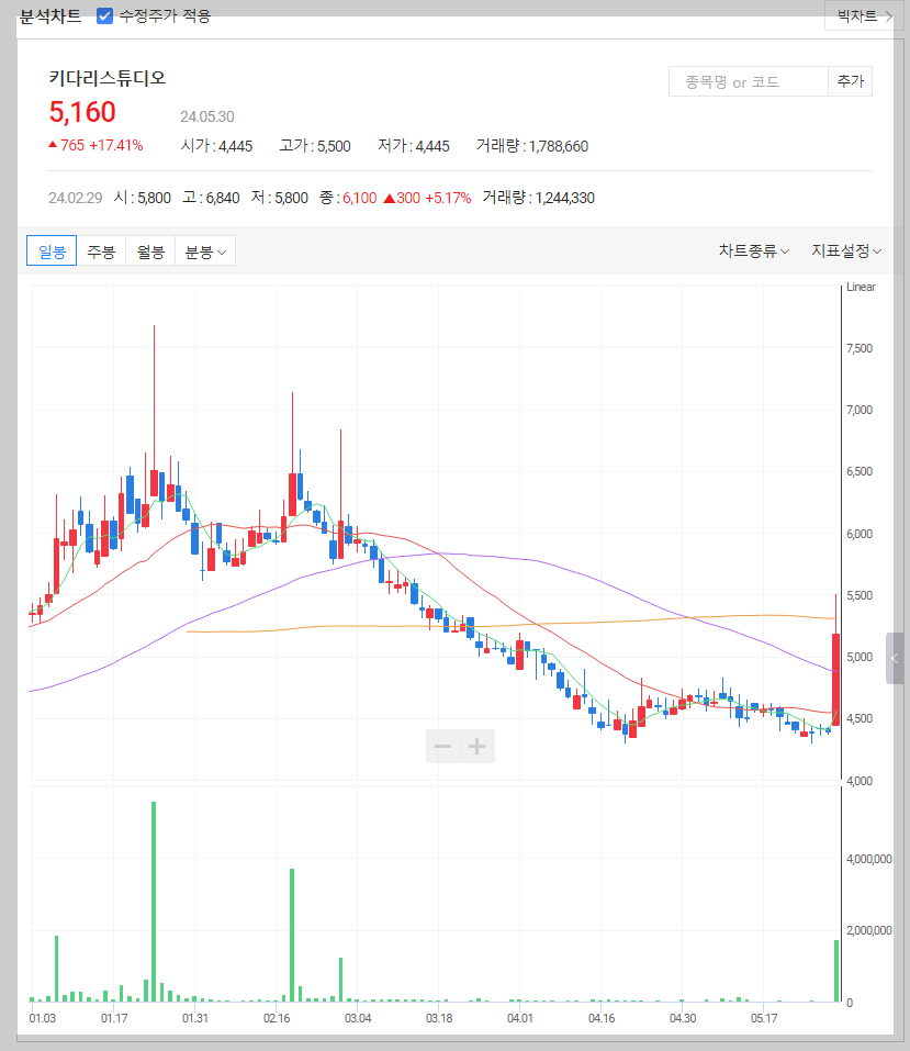 키다리스튜디오 전일 주가는 4,395원이며 전일 대비 +765원의 모습을 보이고 있습니다. 키다리스튜디오의 주주현황을 살펴보면 다우데이타 주주가 전체 지분 44.80%를 소유하고 있습니다. 키다리스튜디오는 미디어 기업으로 장중 기준으로 주가는 4,395원입니다. 키다리스튜디오의 시가 총액은 1982억 원이며 발행 주식수는 37,046,766주입니다. 외국인 보유 비중은 1.06%이며 장중 거래량은 14,376원 을 기록했습니다. 매출액은 494억 원을 달성했습니다. EPS는 없음원이며 키다리스튜디오 주식 배당수익률은 -87%입니다.