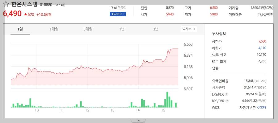 한온시스템 현재 주가는 6,490원이며 전일 대비 +620원의 모습을 보이고 있습니다. 한온시스템의 주주현황을 살펴보면 한앤코오토홀딩스 주주가 전체 지분 69.99%를 소유하고 있습니다. 한온시스템는 자동차부품 기업으로 장중 기준으로 주가는 6,490원입니다. 한온시스템의 시가 총액은 3조 4644억 원이며 발행 주식수는 533,800,000주입니다. 외국인 보유 비중은 15.36%이며 장중 거래량은 5,192,091원 을 기록했습니다. 매출액은 95,593억 원을 달성했습니다. EPS는 357원이며 한온시스템 주식 배당수익률은 4.33%입니다.