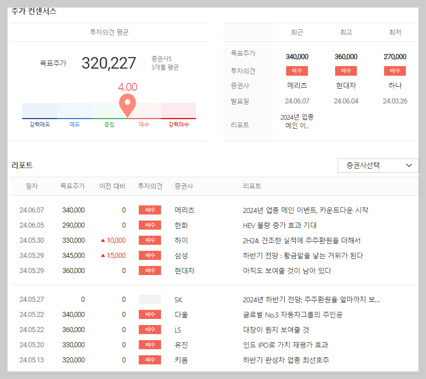 현대차 목표 주가 투자 의견