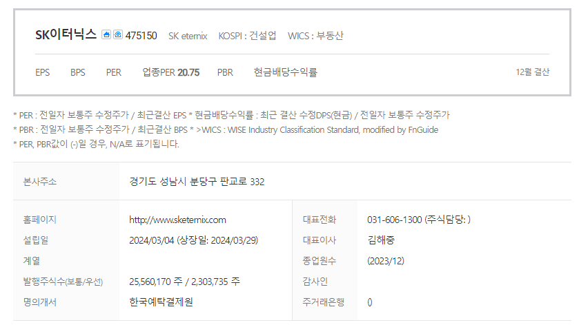 SK이터닉스는 부동산 기업입니다. 대표자는 김해중 이며 설립일은 2024/03/04, 주식 상장일은 2024/03/29입니다. 전체 종업원 수는0명 이고 본사 주소는 경기도 성남시 분당구 판교로 332입니다.